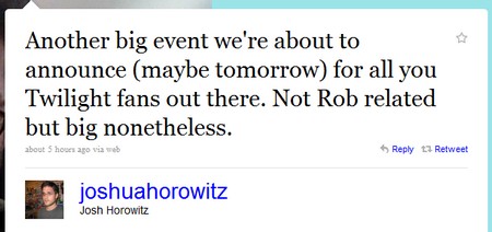 @joshuahorowitz: Outro grande evento estamos para anunciar (talvez amanhã) para todos os fãs de Twilight por aí. Não tem a ver com Rob, mas é grande coisa.